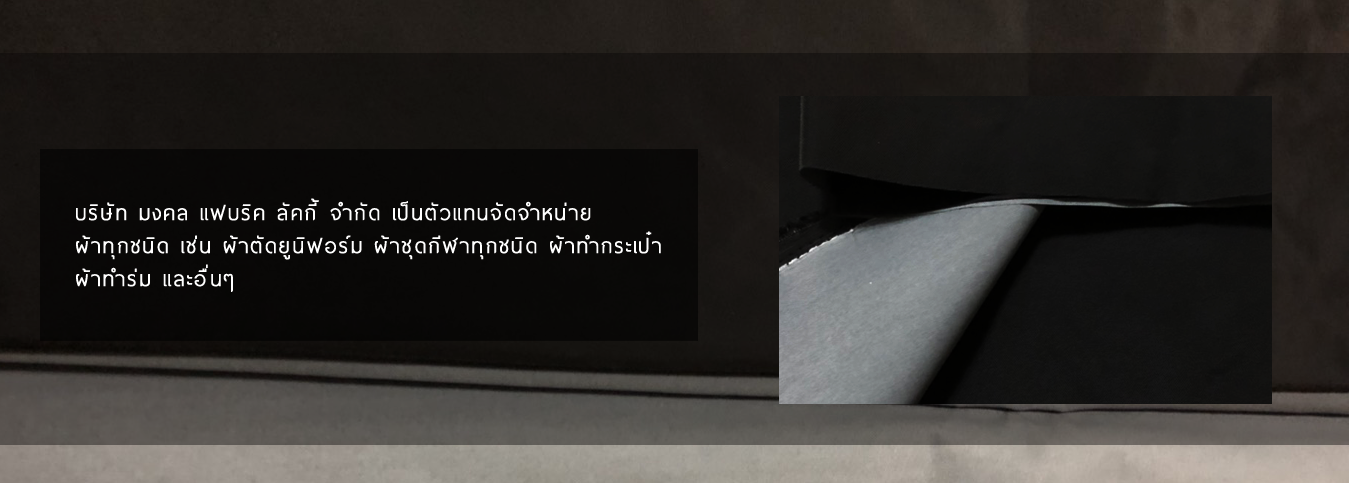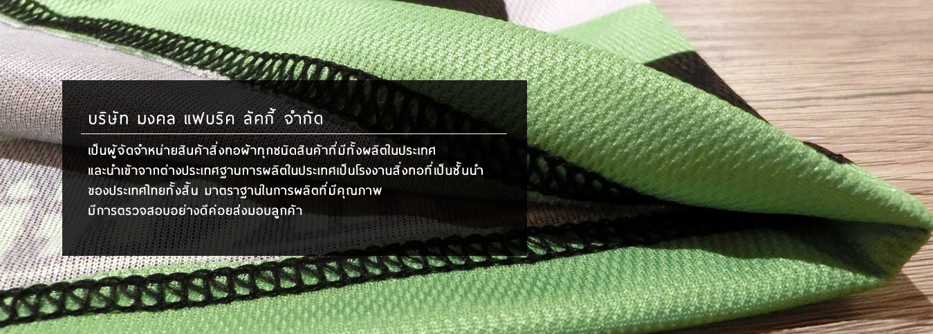 บริษัท มงคล แฟบริค ลัคกี้ จำกัด เป็นตัวแทนจัดจำหน่าย ผ้าทุกชนิด เช่น ผ้า ตัดยูนิฟอร์ม ผ้าชุดกีฬาทุกชนิด, ผ้าทำกระเป๋า,ผ้าทำร่ม และอื่นๆ ในกลุ่มของชนิดผ้าเช่น 100% Polyester Taffeta 190T / Oxford 300D,600D,1200D. 100% Nylon Taffeta 210T,190T /Oxford 210D,420D ,Cordula, TC,Com Twill, Solon D-Y . ในกลุ่มของผ้า Knitting เช่น TC,TK,Micro Interlock,CVC,Cottoและอื่นๆภายใต้ฐานการผลิตของกลุ่มโรงงานที่มีคุณภาพใน การย้อมที่ได้มาตราฐานและการบริการที่ประทับใจการส่งมอบลูกค้าได้ตามกำหนดด้วยประสบการณ์ที่มีในการคัดสรรพผ้าชนิดต่างๆเพื่อตอบสนองความต้องการของผู้บริโภคให้ตรงเป้าหมายมากที่สุด
